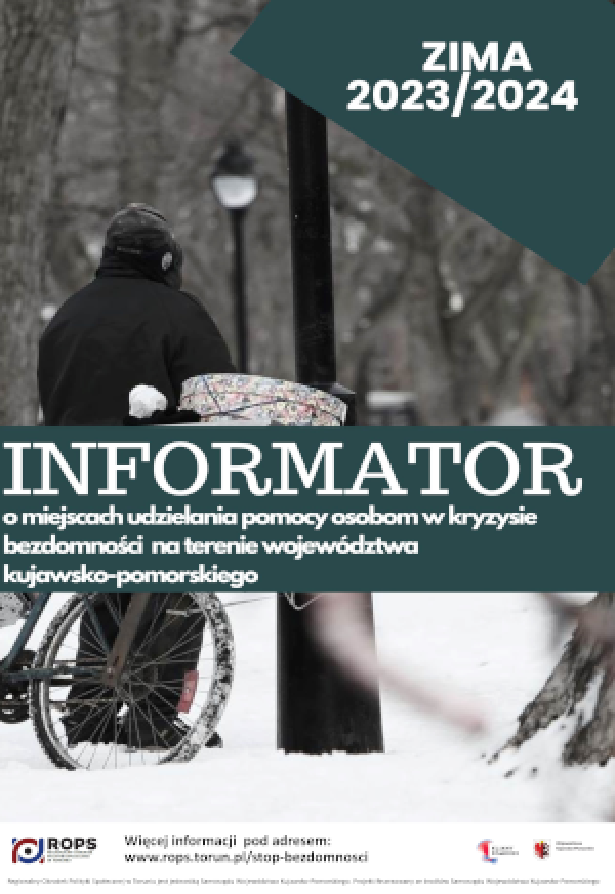 Zapraszamy do zapoznania się z materiałami opracowanymi w ramach projektu informacyjnego na temat udzielania pomocy osobom bezdomnym w województwie kujawsko-pomorskim „Akcja Zima 2023/2024”.