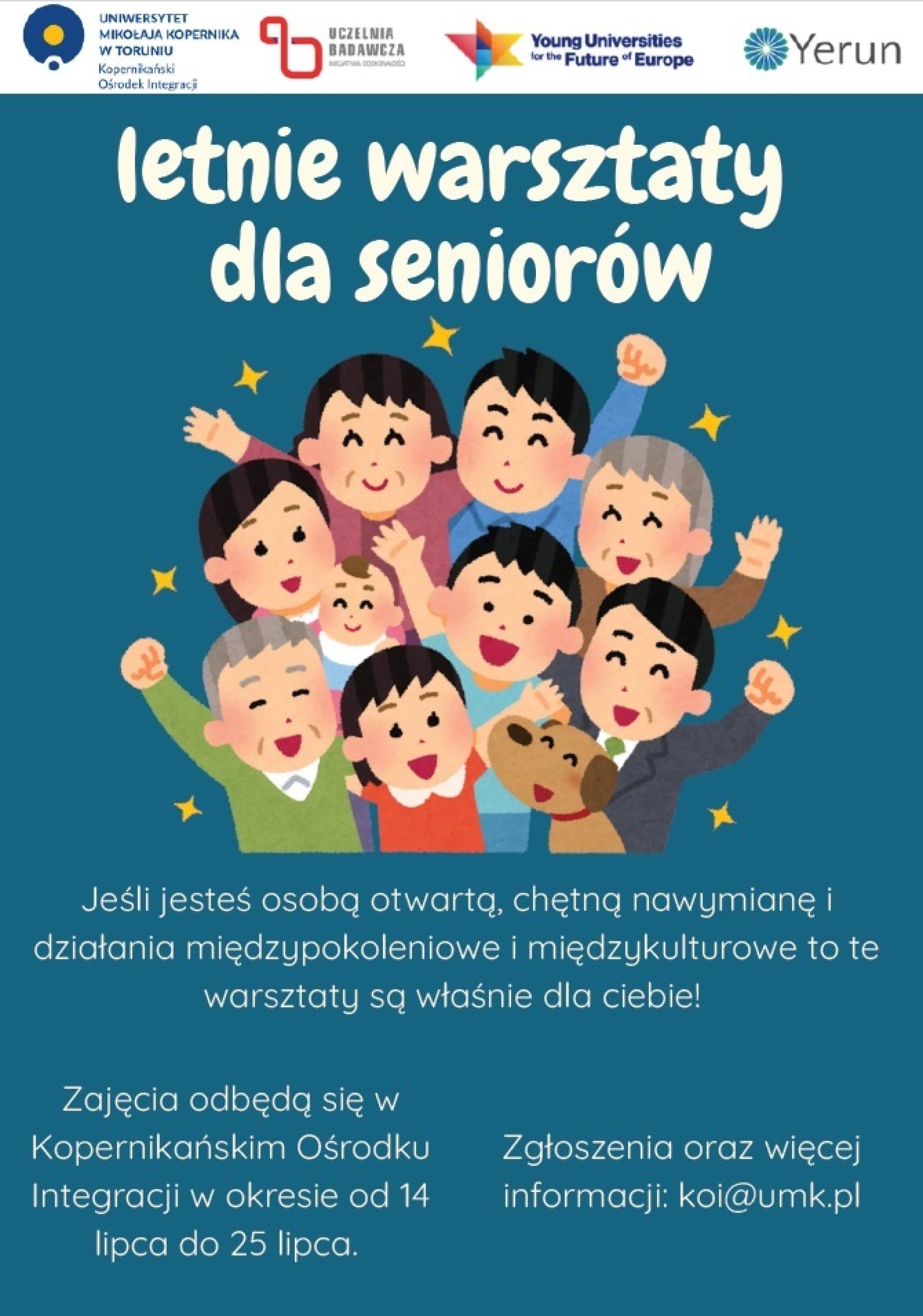 Kopernikański Ośrodek Integracji UMK serdecznie zaprasza Seniorki i Seniorów z Torunia na wyjątkowe letnie warsztaty, które odbędą się od 14 do 25 lipca 2025 r.