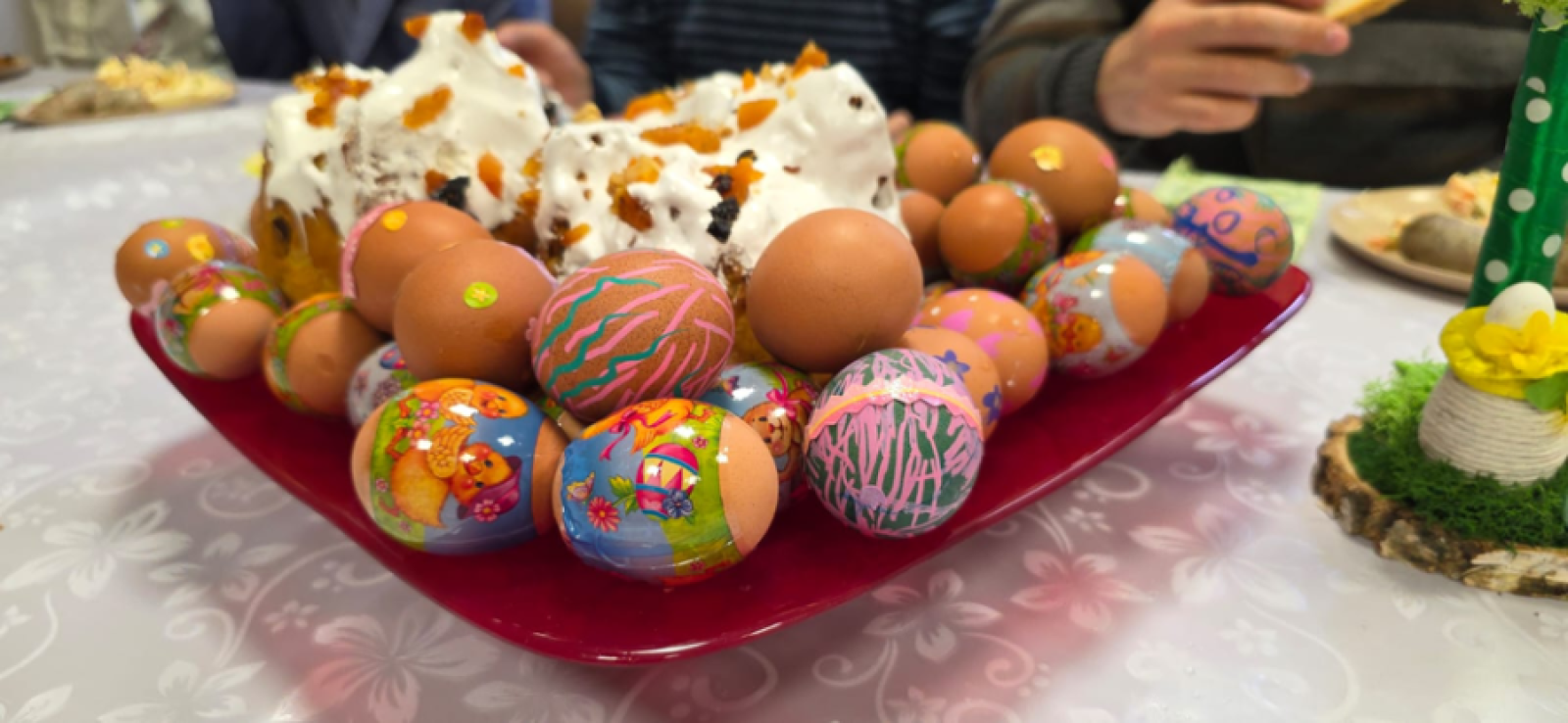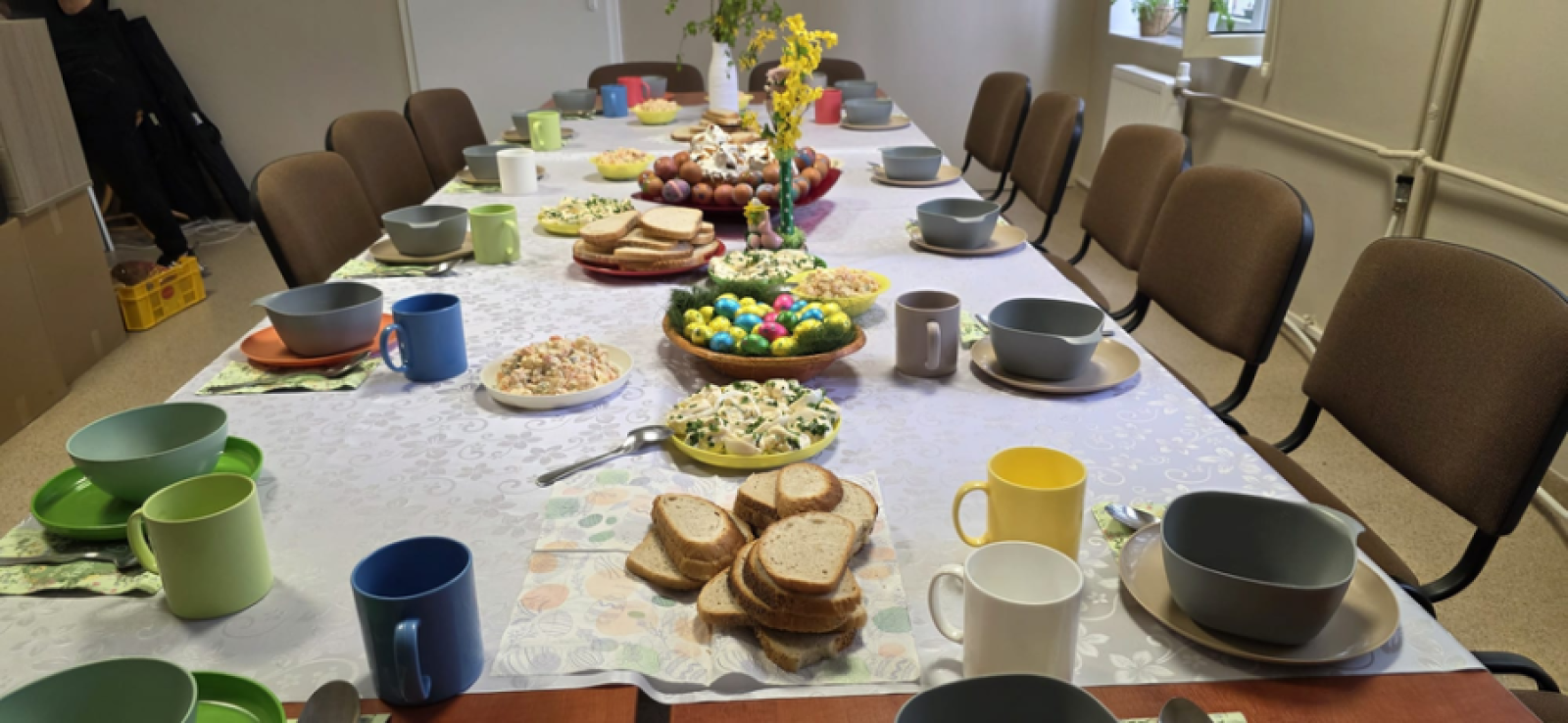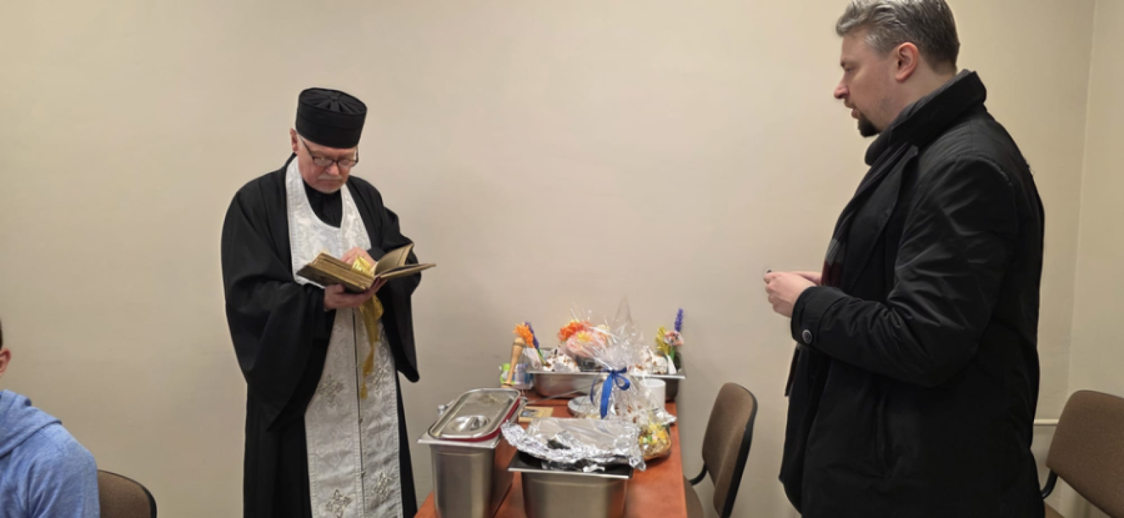 W Wielką Sobotę zorganizowaliśmy tradycyjne święcenie pokarmów, podczas którego obecny był batiuszka – kapłan Kościoła prawosławnego z parafii św. Mikołaja z Torunia. Uroczystość miała bardzo podniosły charakter. Poświęcone zostały koszyczki z typowymi wielkanocnymi potrawami: jajkami, chlebem, paschą, wędlinami i innymi symbolami odradzającego się życia. Batiuszka pobłogosławił uczestników i skierował do nich słowa otuchy i duchowego wsparcia. Potem odbyło się wspólne śniadanie wielkanocne, przygotowane zgodnie z prawosławną tradycją. Przy stole zapanowała ciepła, rodzinna atmosfera – nie zabrakło modlitwy, życzeń i rozmów, które często toczyły się w języku ukraińskim. Dla wielu uczestników była to pierwsza okazja od dłuższego czasu, by celebrować święta w gronie osób, które rozumieją ich kulturę, zwyczaje i wiarę.