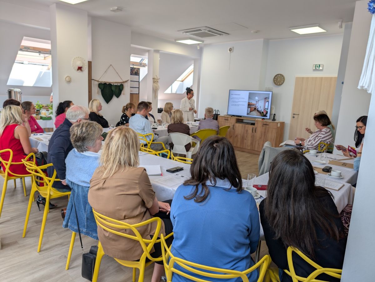 Merytorycznym fundamentem spotkania było wystąpienie prof. Marty Podhoreckiej na temat innowacyjnego podejścia opartego na pozytywnym starzeniu się. Przedstawione wyniki ankiet samooceny jednoznacznie potwierdziły konieczność wzmacniania kompetencji w sektorze opieki senioralnej. Centralnym punktem agendy był warsztat przeprowadzony metodą „World Café”, poświęcony dopracowaniu narzędzia „Profil kompetencji” (WP2). Uczestnicy aktywnie dzielili się opiniami, co pozwoliło na zebranie szczegółowych uwag niezbędnych do finalizacji tego narzędzia.
