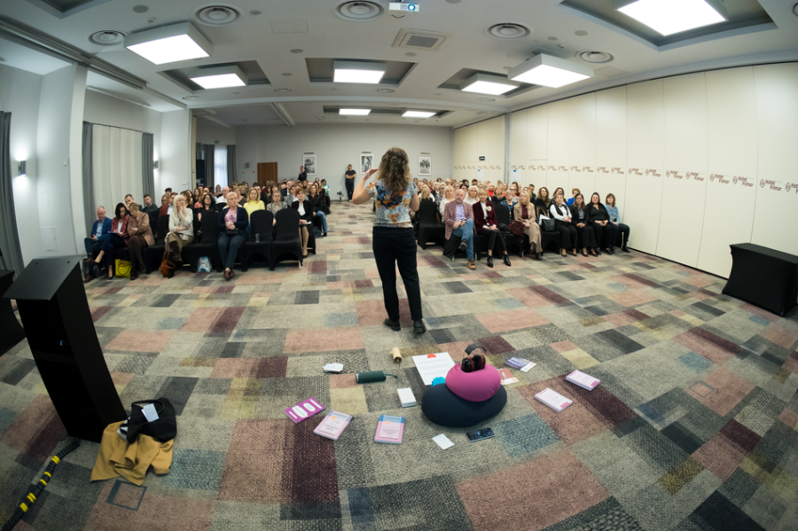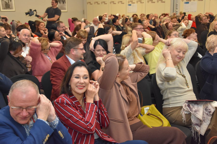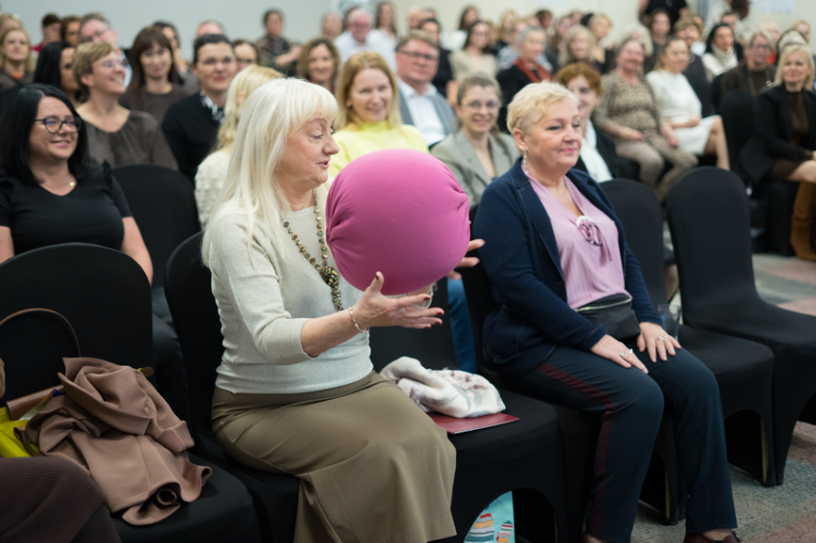 A praktyka? Izabela Chlewińska - choreografka, tancerka i pedagog –zaproponowała uczestnikom Forum składający się z prostych ćwiczeń praktyczny trening redukcji stresu. A uczestnicy bardzo się w niego zaangażowali.
